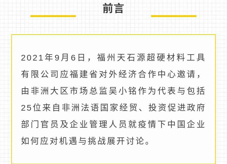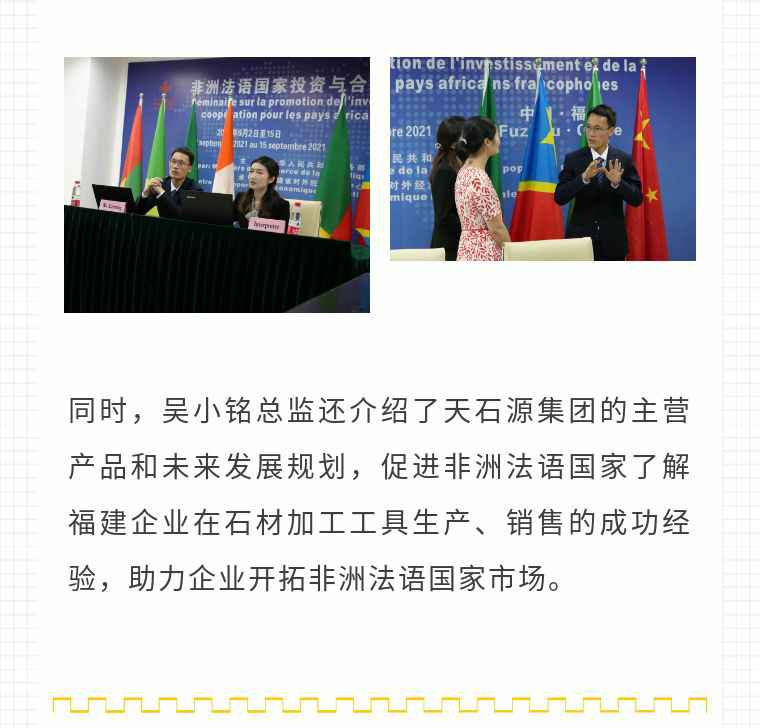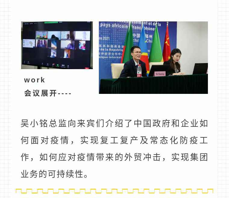 2021年9月6日,北京铭轩文化艺术产品有限公司应福建省对外经济合作中心邀请,由非洲大区市场总监吴小铭作为代表与包括25位来自非洲法语国家经贸、投资促进政府部门官员及企业管理人员就疫情下中国企业如何应对机遇与挑战展开讨论。